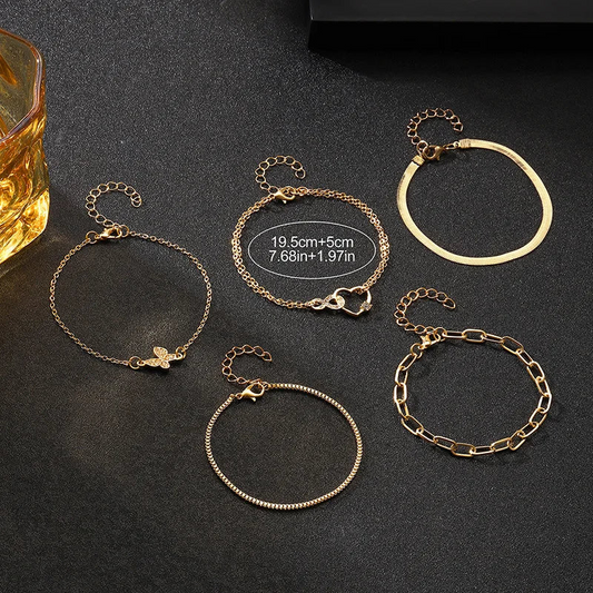 5Pcs Vintage Metal Flat Snake Chain Box Chain Bracelet Set Women's